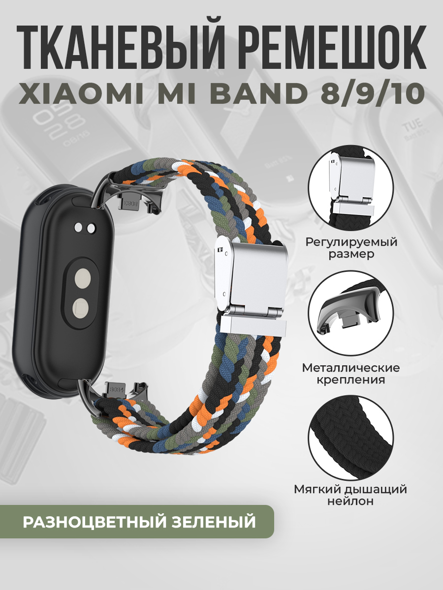 Тканевый ремешок для Xiaomi Mi Band 8/9/10, металлическая застежка, разноцветный зеленый