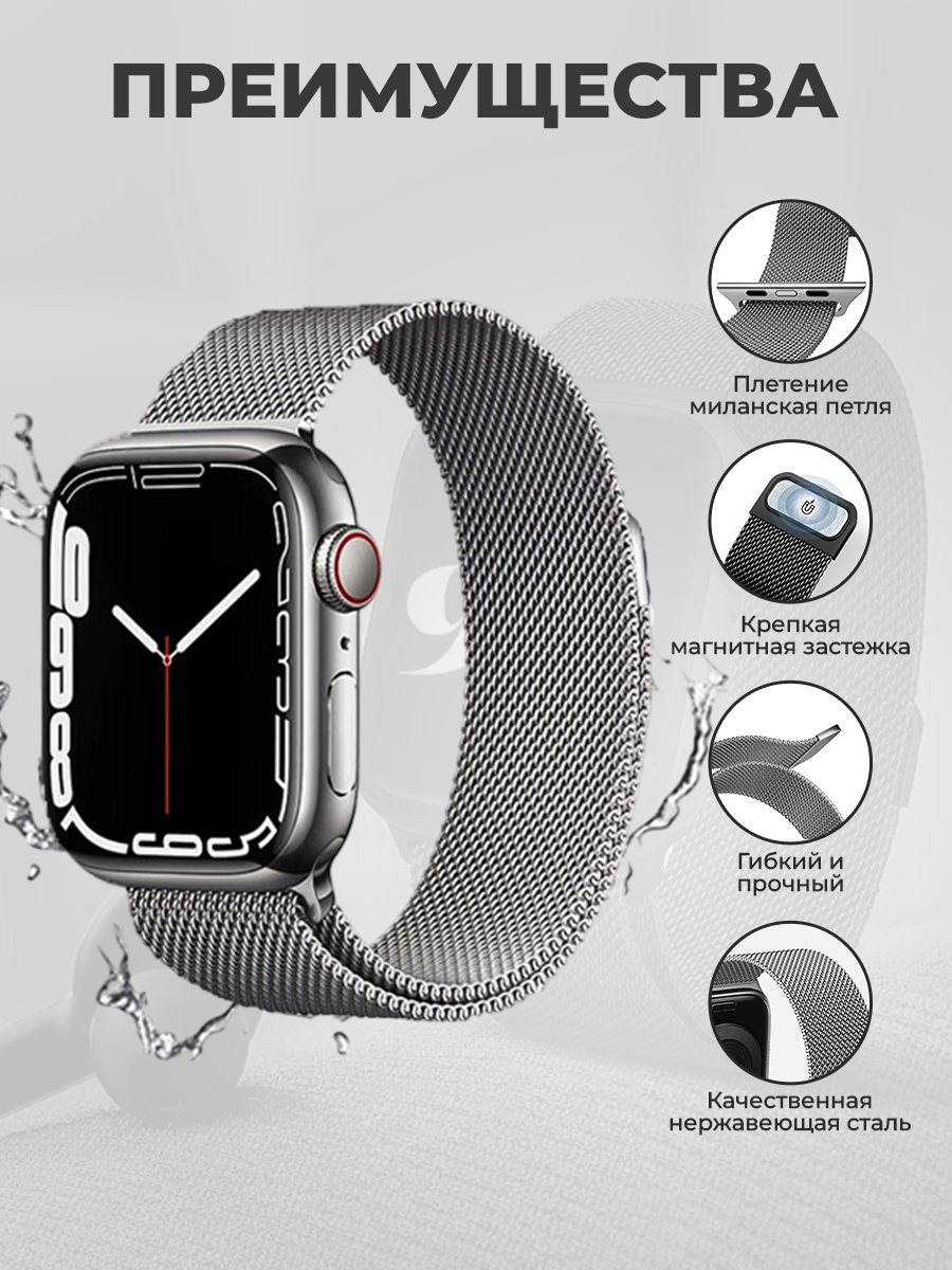 Этот ремешок предназначен для моделей Apple Watch 1-10, SE 1-ой и 2-ой версии, а так же ULTRA 1-ой и 2-ой версии, с высотой экрана 42, 44, 45, 46, 49 мм, будьте внимательны при выборе. Подарите своему Apple Watch стильный и элегантный вид с металлическим ремешком миланская петля, идеально подходящим для моделей Apple Watch 1-10, SE, ULTRA. Этот ремешок эпл вотч не только подчеркнет вашу индивидуальность, но и обеспечит превосходный комфорт при носке. Ремешок миланская петля для вотчп se 46 выполнен из тонкой высококачественной нержавеющей стали, что делает его не только стильным, но и долговечным. Его (вотч 10 44 мм) уникальная плетеная структура придает изделию изысканный вид — идеально подходит как для повседневного использования, так и для особых случаев. Вы можете быть уверены, что ваш ремешок Apple Watch 42 будет идеально подходить для вашего устройства. Металлический нержавеющий ремешок миланская петля оснащен магнитной застежкой, которая позволяет легко регулировать длину по вашему усмотрению, обеспечивая надежную и комфортную посадку на запястье. Ремешок Элл вотч миланская петля не только выглядит шикарно, но и приятен на ощупь, что делает его идеальным выбором для ежедневного ношения. Носите его с уверенностью, зная, что он удовлетворит любые ваши требования. Если вы ищете стильный и функциональный аксессуар для себя или в подарок на новый год, день рождения, 8 марта, 23 февраля, подарок начальнику или на другой праздник, ремешок Apple Watch миланская петля станет отличным вариантом. Этот уникальный аксессуар обязательно понравится любому обладателю техники Apple (эпл). Обновите образ вашего Apple Watch с помощью этого утонченного ремешка миланская петля и выделяйтесь из толпы!