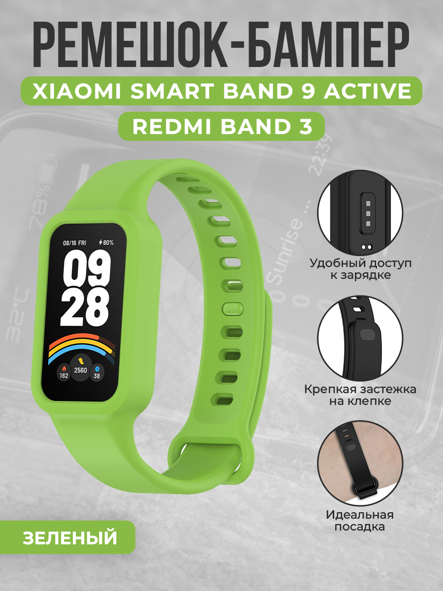 Силиконовый ремешок-бампер для Xiaomi Smart Band 9 Active / Redmi Band 3, зеленый