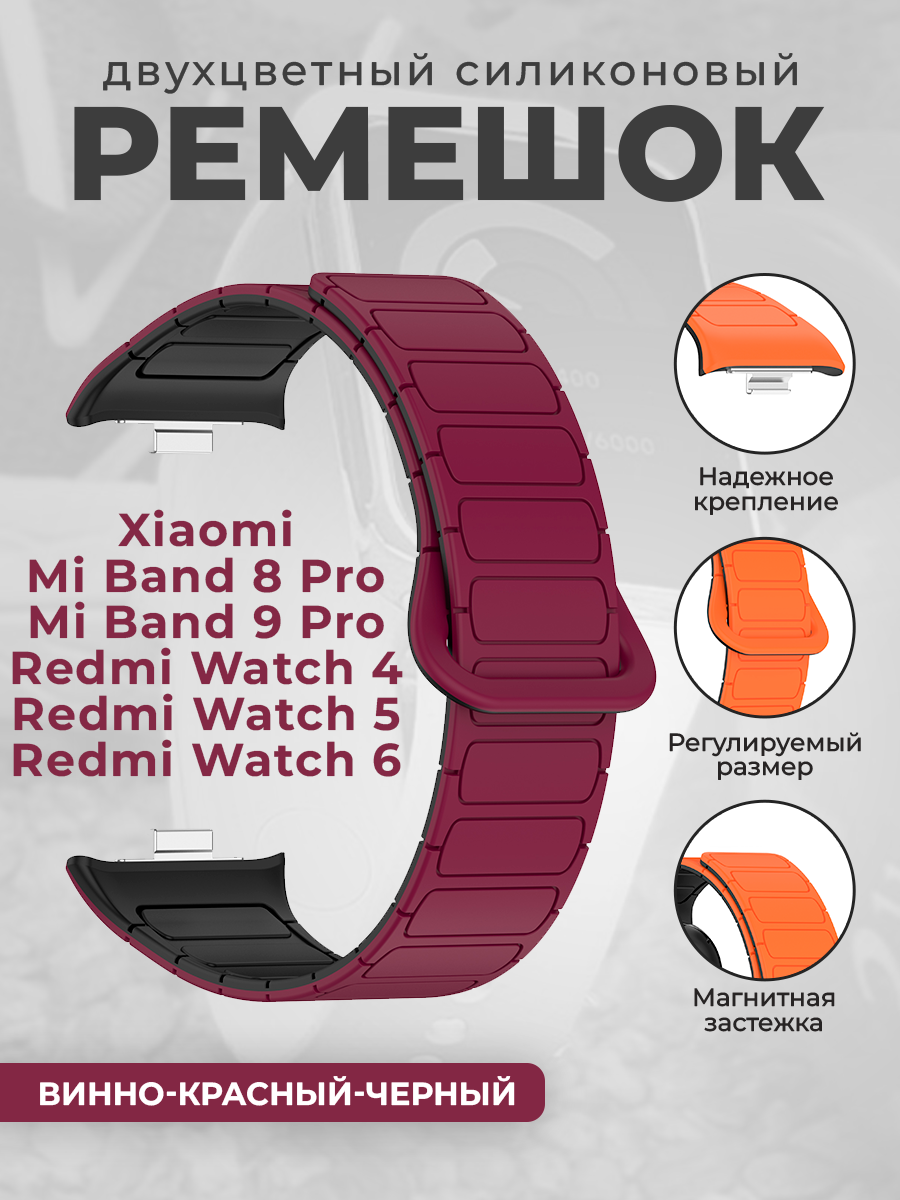 Двухцветный силиконовый ремешок для Xiaomi Mi Band 8 Pro/9 Pro и Redmi Watch 4/5/6, винно-красный-черный