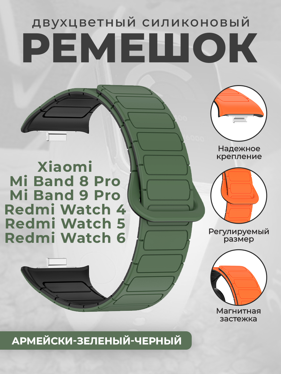 Двухцветный силиконовый ремешок для Xiaomi Mi Band 8 Pro/9 Pro и Redmi Watch 4/5/6, армейски-зеленый-черный