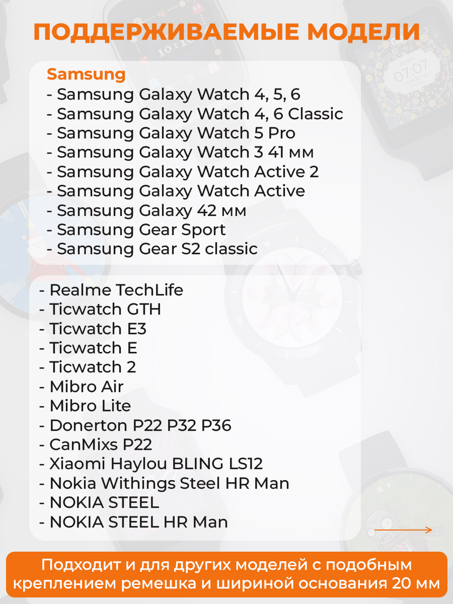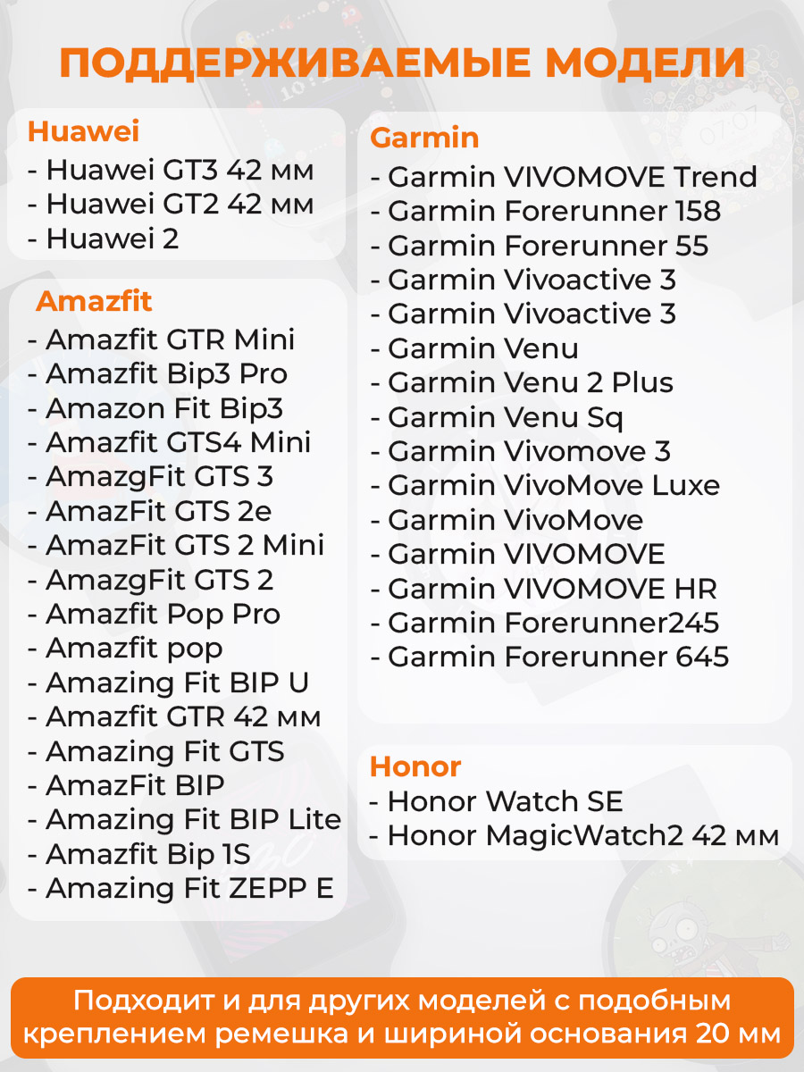 Ремешок для часов универсальный 20 мм был разработан с учетом потребностей потребителей, что делает его подходящим для множества популярных брендов, таких как Amazfit GTR,BIP (Амазфит жтр, бип), Garmin Forerunner/Venu/Vivo (Форераннер, Вену, Виво); Samsung Galaxy Watch (Самсунг Гелакси Вотч), Huawei Watch (Хуавей Вотч) Honor Watch (Хонор Вотч) Realme (Риалми) Haylou (Хайлоу) Xiaomi (Сиаоми/Сяоми/Ксиоми/Ксиаоми), Mibro (Мибро), COROS (Корос), TicWatch Pro (ТикВотч Про). Подробный перечень совместимых моделей можно посмотреть в галерее изображений.