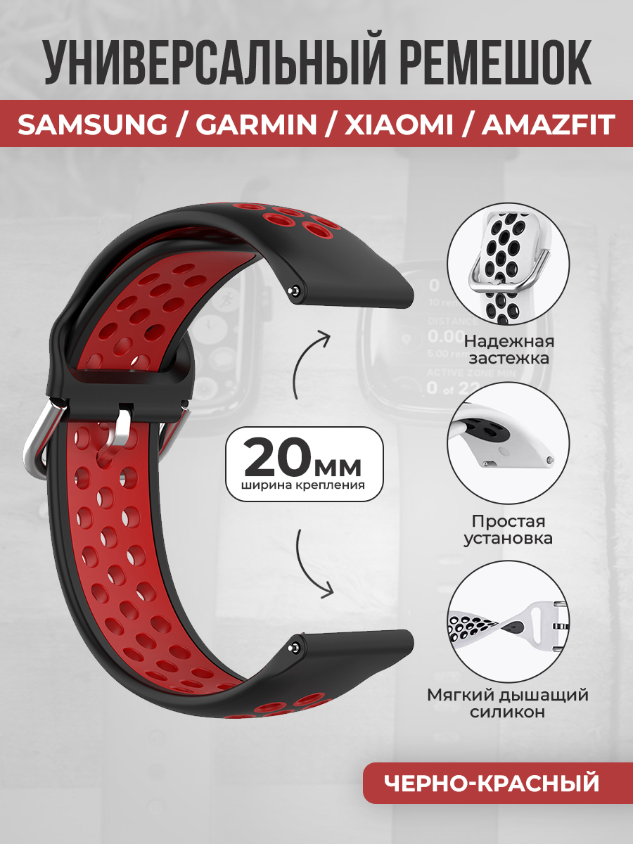 Универсальный ремешок для Samsung, Garmin, Xiaomi, Amazfit, 20 мм, черно-красный