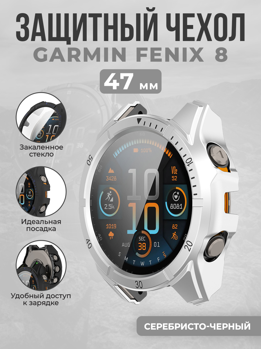 Защитный чехол-стекло для Garmin Fenix 8, 47 мм, серебристо-черный