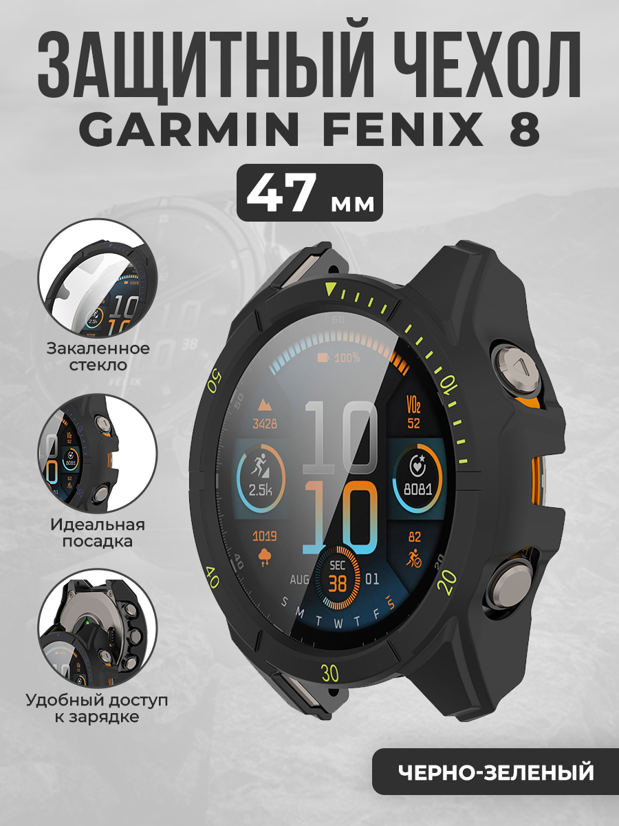 Защитный чехол-стекло для Garmin Fenix 8, 47 мм, черно-зеленый