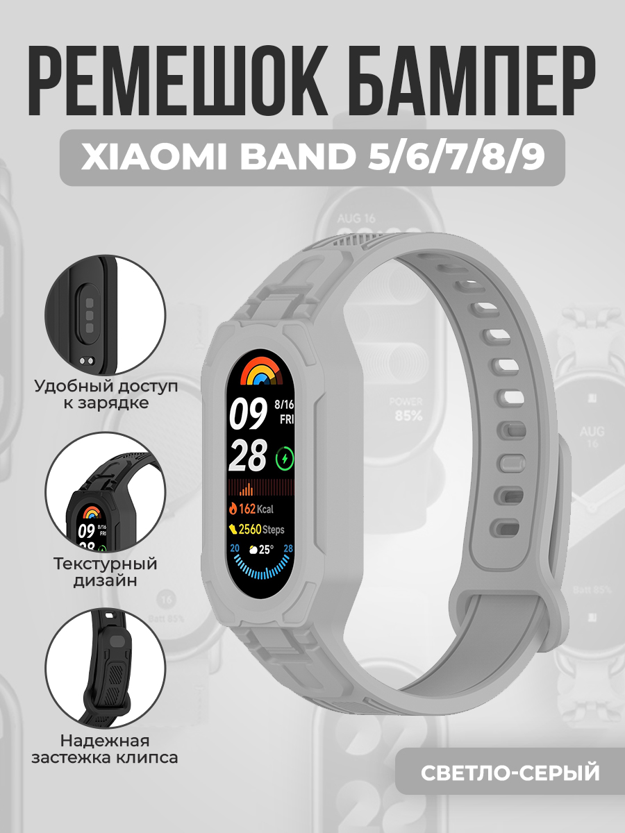 Ремешок бампер для Xiaomi Band 5/6/7/8/9, светло-серый