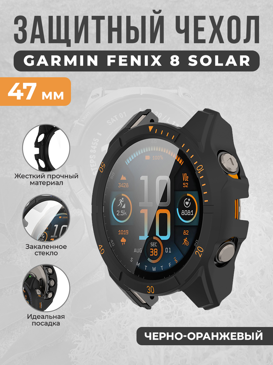 Защитный чехол со стеклом и выделенной шкалой для Garmin Fenix 8 Solar 47 мм, черно-оранжевый