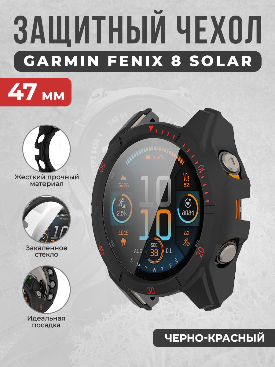 Защитный чехол со стеклом и выделенной шкалой для Garmin Fenix 8 Solar 47 мм, черно-красный