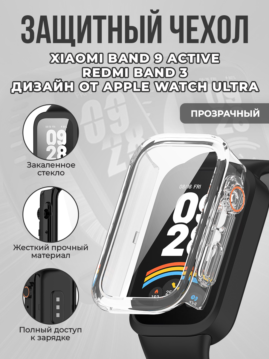 Жесткий защитный чехол со стеклом для Xiaomi Band 9 Active/Redmi Band 3/Apple Watch Ultra, прозрачный