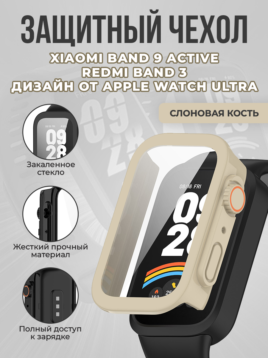 Жесткий защитный чехол со стеклом для Xiaomi Band 9 Active/Redmi Band 3/Apple Watch Ultra, слоновая кость