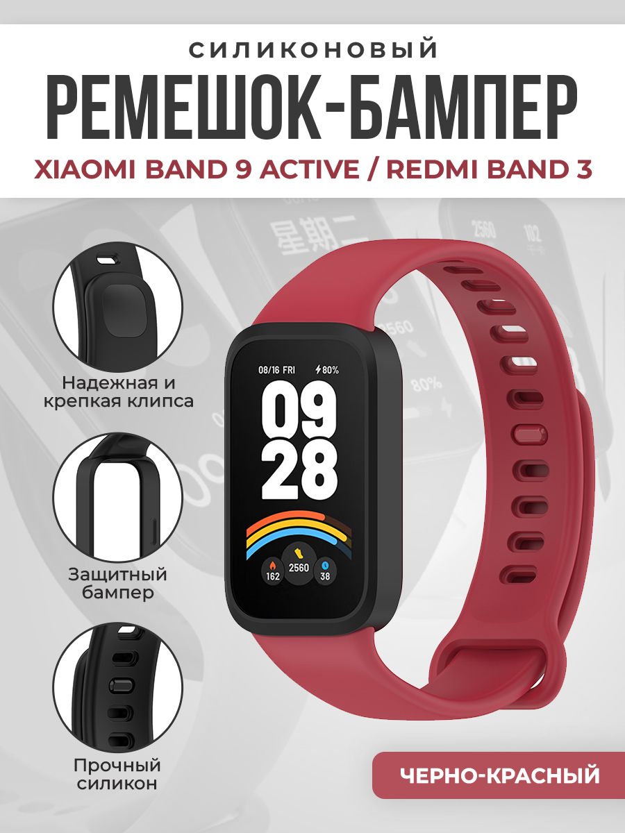 Силиконовый ремешок-бампер для Xiaomi Band 9 Active/Redmi Band 3, черно-красный
