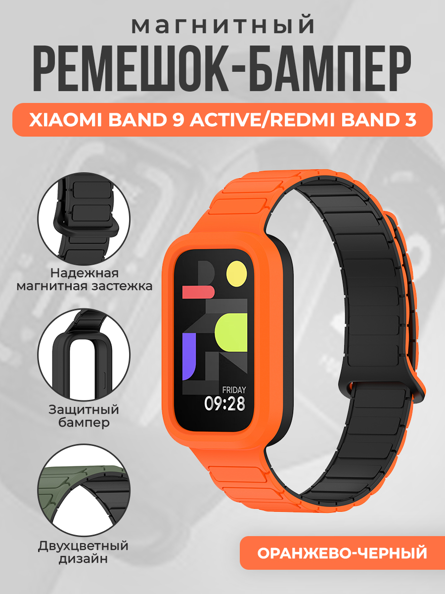 Двухцветный магнитный ремешок-бампер для Xiaomi Band 9 Active/Redmi Band 3, оранжево-черный