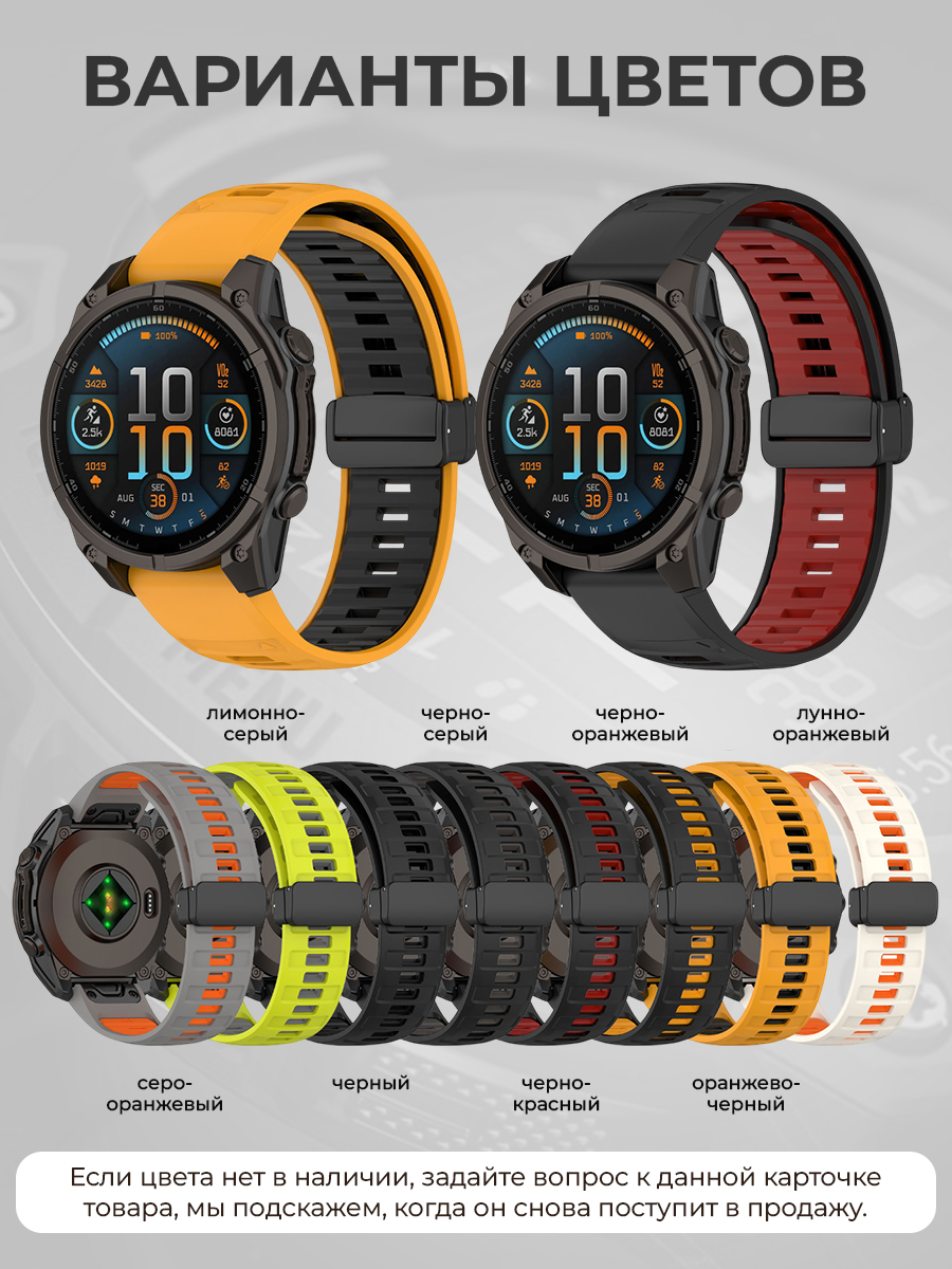 С двухцветным силиконовым ремешком ваш Гармин Феникс 8 или Тактикс 8, 22 мм станет не только функциональным устройством, но и стильным аксессуаром. Этот ремешок отлично подходит как для активного отдыха, так и для повседневного ношения, дополняя ваш образ. Удобный и легкий, он не натирает кожу даже при длительном использовании.