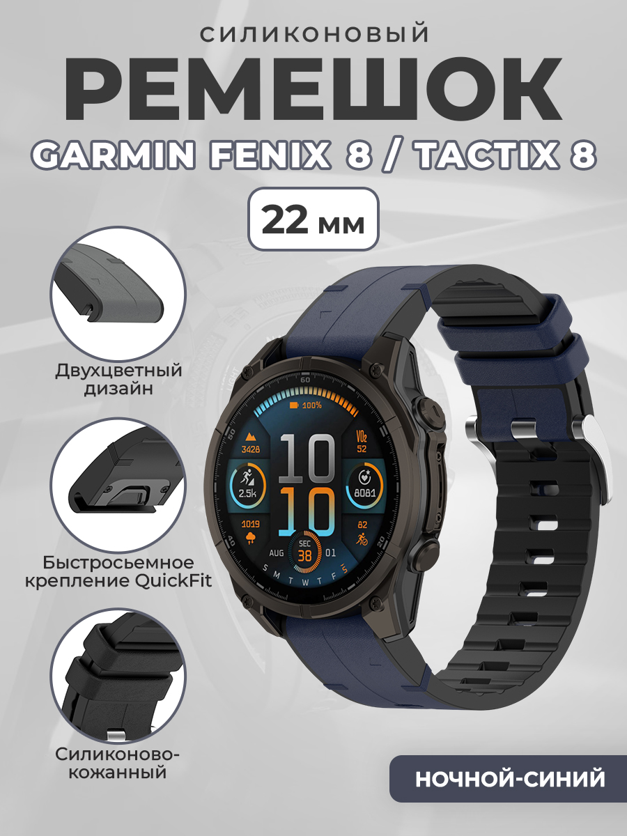 Силиконовый кожаный ремешок для Garmin Fenix 8/Tactix 8, 22 мм, ночной-синий