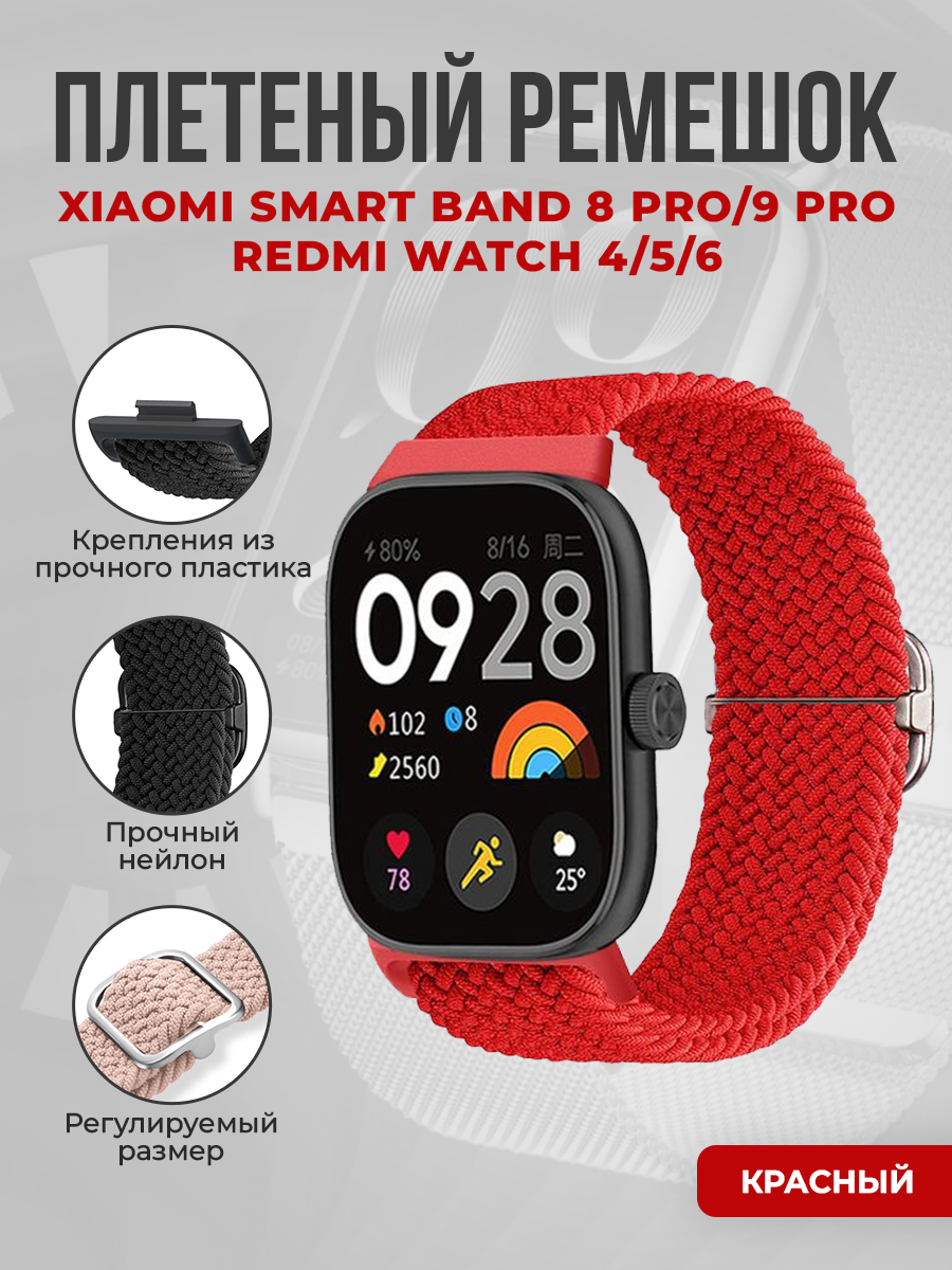 Плетеный нейлоновый ремешок для Xiaomi Smart Band 8 Pro/9 Pro / Redmi Watch 4/5/6, регулируемый по длинее, красный