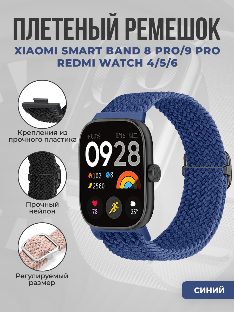 Плетеный нейлоновый ремешок для Xiaomi Smart Band 8 Pro/9 Pro / Redmi Watch 4/5/6, регулируемый по длинее, синий