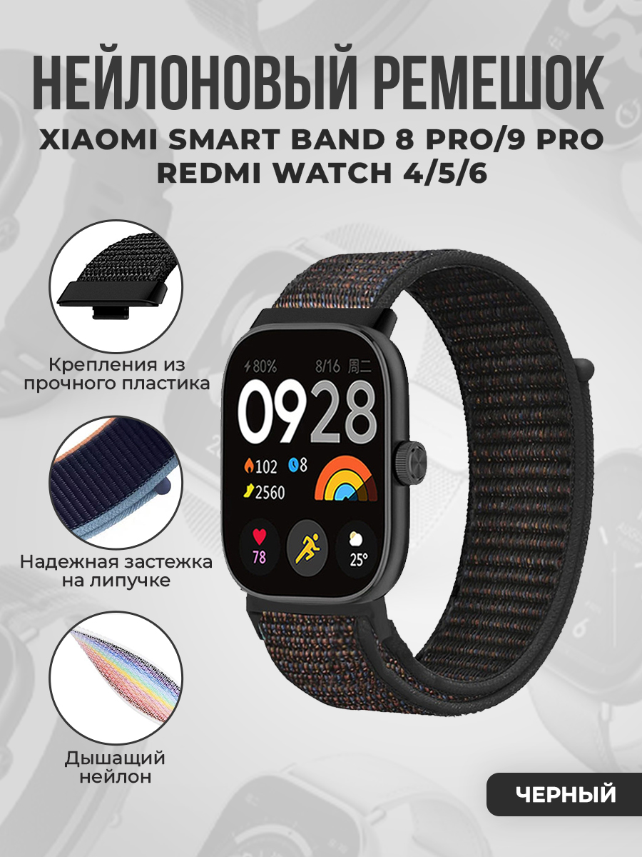 Нейлоновый ремешок на липучке для Xiaomi Smart Band 8 Pro/9 Pro / Redmi Watch 4/5/6, черный