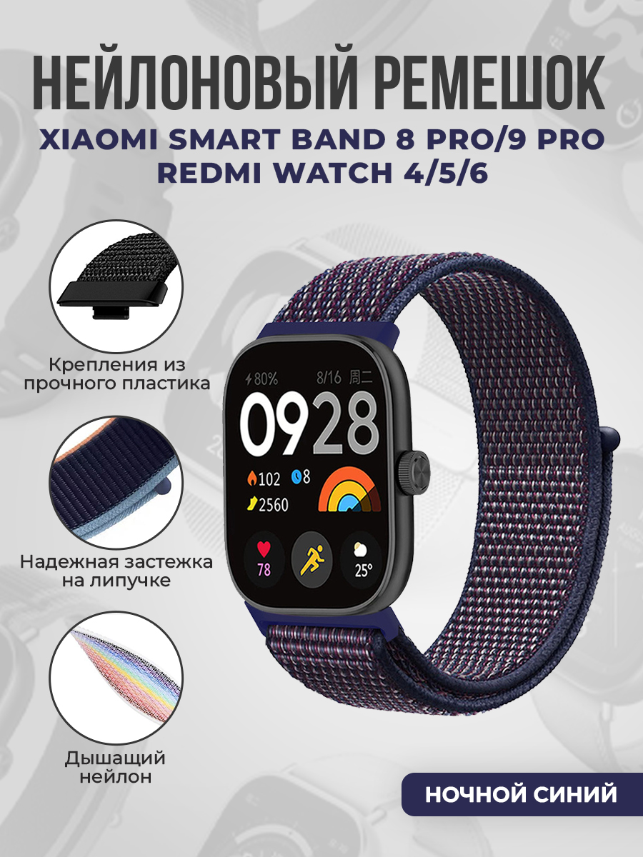 Нейлоновый ремешок на липучке для Xiaomi Smart Band 8 Pro/9 Pro / Redmi Watch 4/5/6, ночной синий