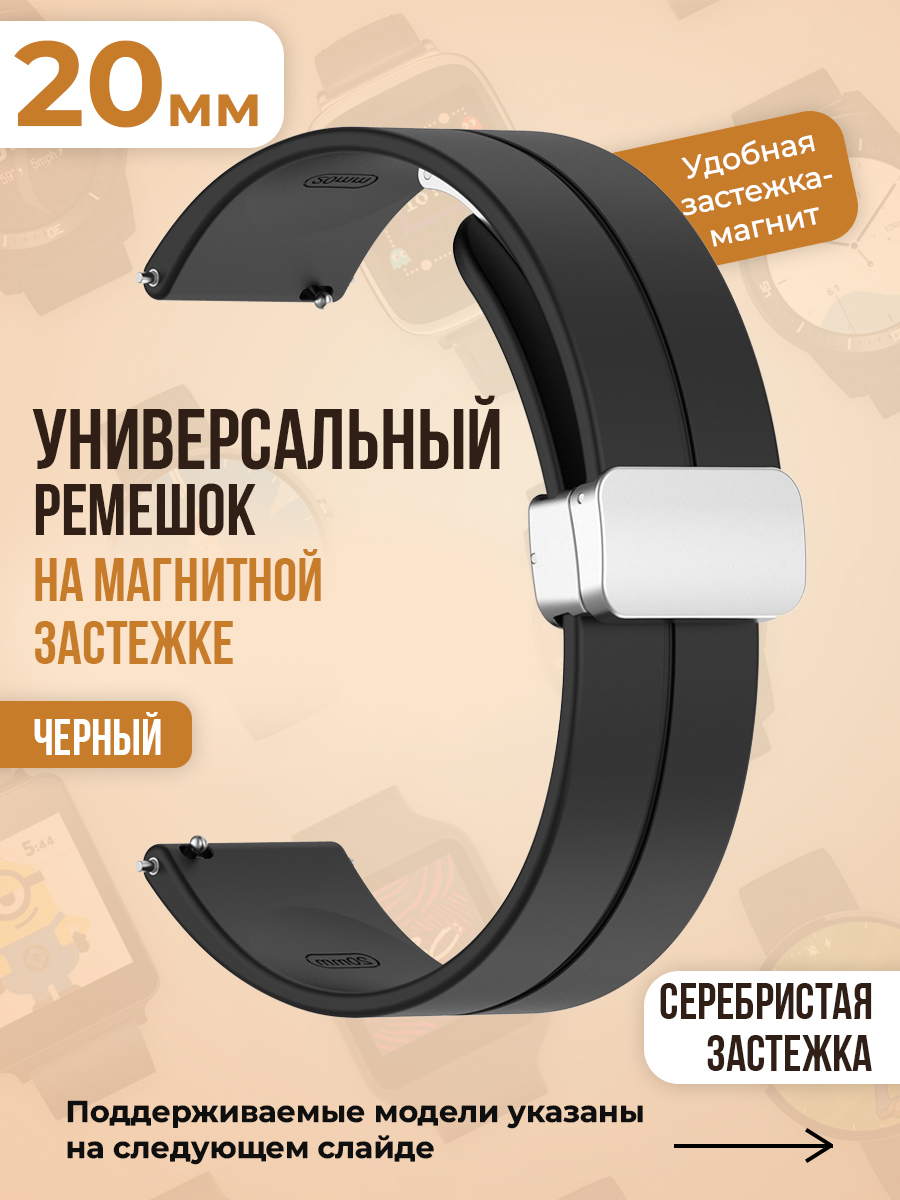 Универсальный силиконовый ремешок с магнитом 20 мм, серебристая застежка, черный