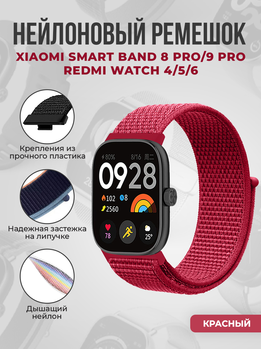 Нейлоновый ремешок на липучке для Xiaomi Smart Band 8 Pro/9 Pro / Redmi Watch 4/5/6, красный