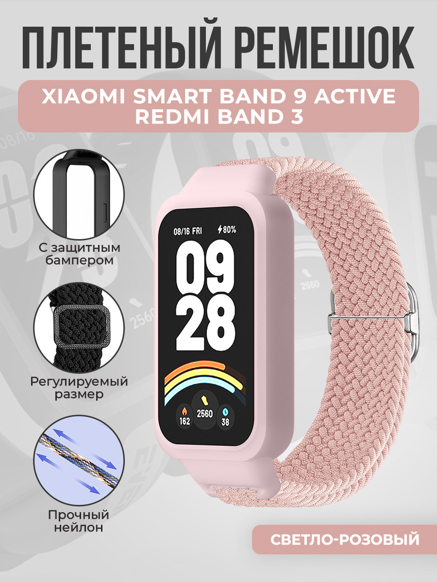 Плетеный ремешок с защитным чехлом для Xiaomi Smart Band 9 Active/Redmi Band 3, светло-розовый