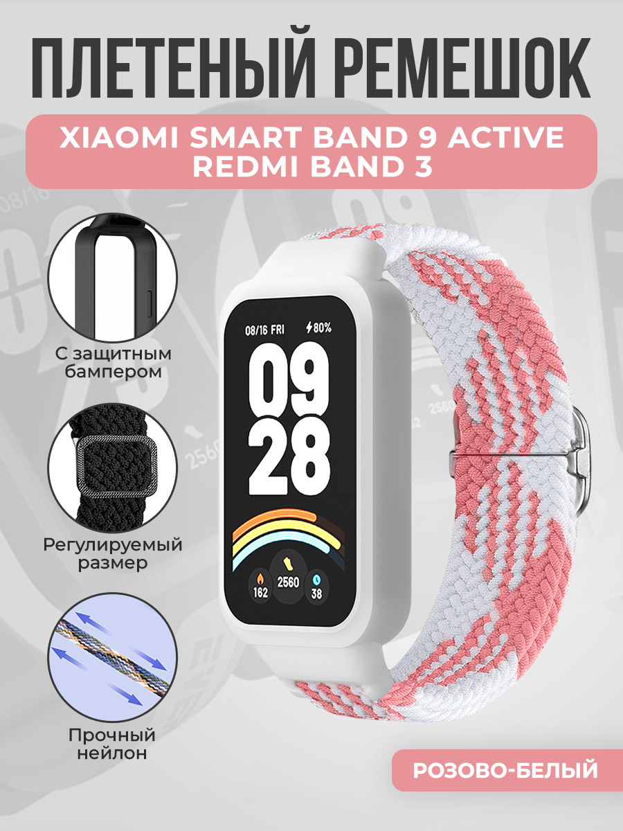 Плетеный ремешок с защитным чехлом для Xiaomi Smart Band 9 Active/Redmi Band 3, розово-белый