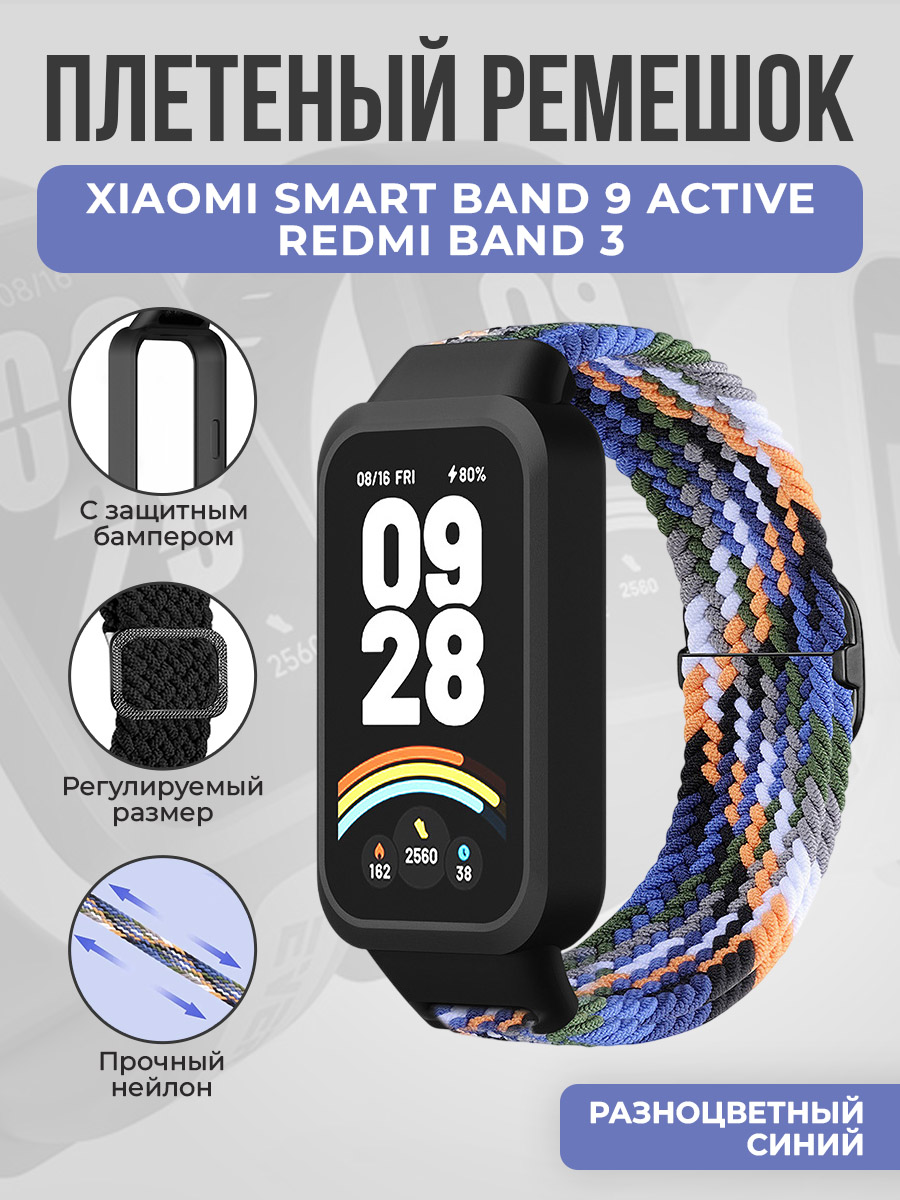 Плетеный ремешок с защитным чехлом для Xiaomi Smart Band 9 Active/Redmi Band 3, разноцветный синий