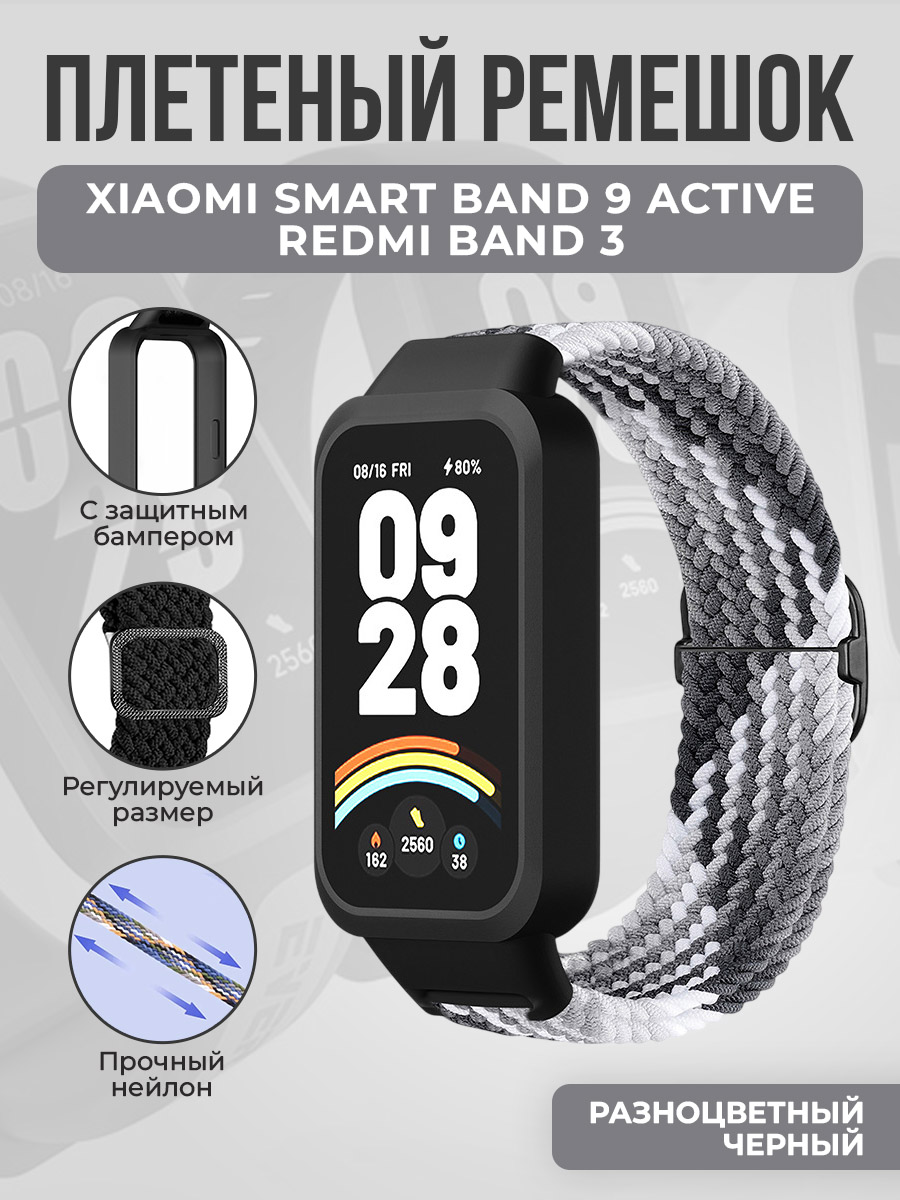 Плетеный ремешок с защитным чехлом для Xiaomi Smart Band 9 Active/Redmi Band 3, разноцветный черный
