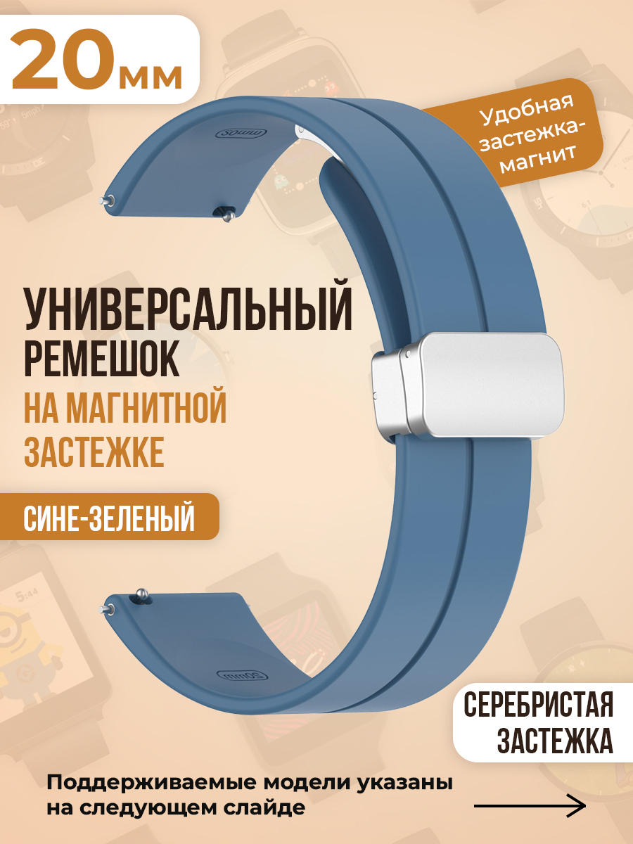 Универсальный силиконовый ремешок с магнитом 20 мм, серебристая застежка, сине-зеленый