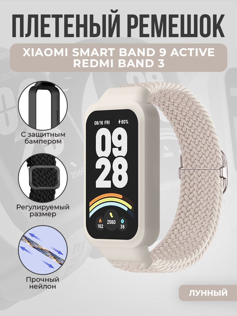 Плетеный ремешок с защитным чехлом для Xiaomi Smart Band 9 Active/Redmi Band 3, лунный