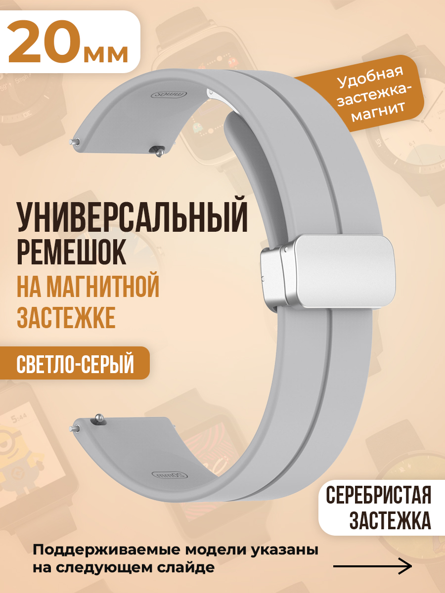 Универсальный силиконовый ремешок с магнитом 20 мм, серебристая застежка, светло-серый