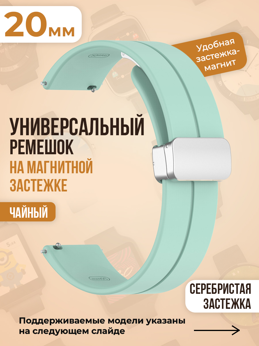 Представляем вашему вниманию универсальный силиконовый ремешок с магнитом 20 мм, серебристой застежкой — оптимальный выбор для тех, кто ищет качественный и стильный ремешок для смарт часов Huawei и Honor 20 мм . Этот силиконовый ремешок с прочной застежкой серебрянного цвета идеально подходит для различных моделей смарт-часов Fossil и умных-часов Xiaomi, обеспечивая надежную фиксацию и максимальный комфорт.