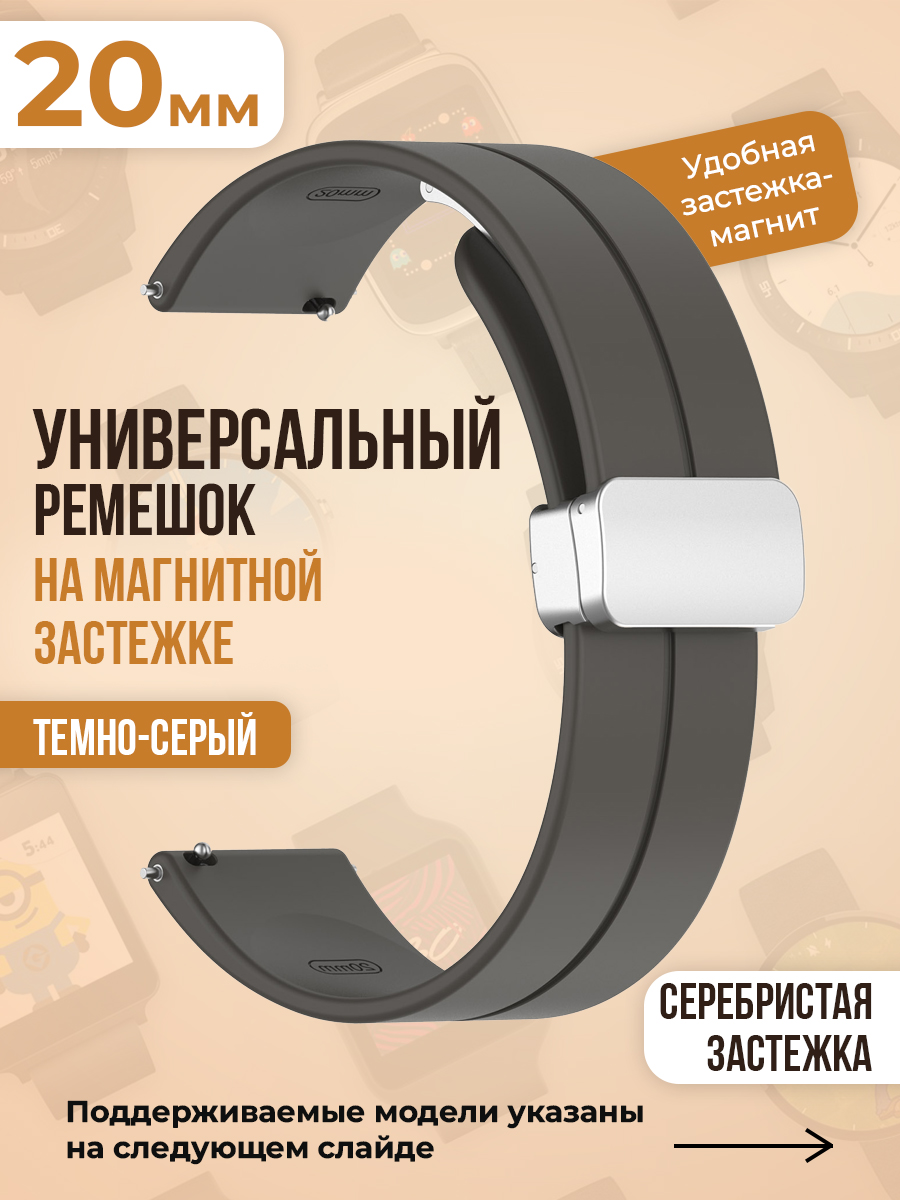 Универсальный силиконовый ремешок с магнитом 20 мм, серебристая застежка, темно-серый