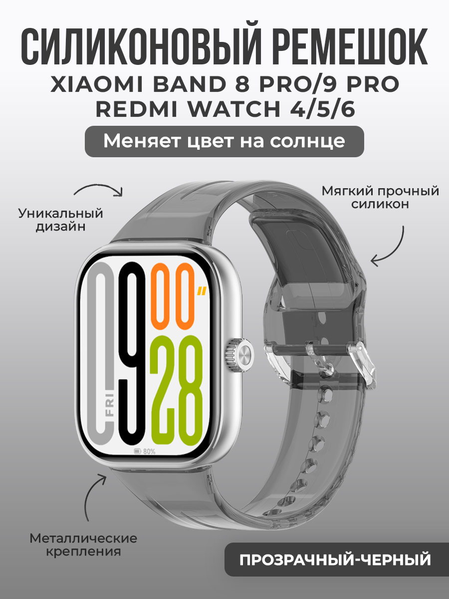 Силиконовый ремешок Xiaomi Band 8 Pro/9 Pro/Redmi Watch 4/5/6, меняет цвет на солнце, прозрачный-черный