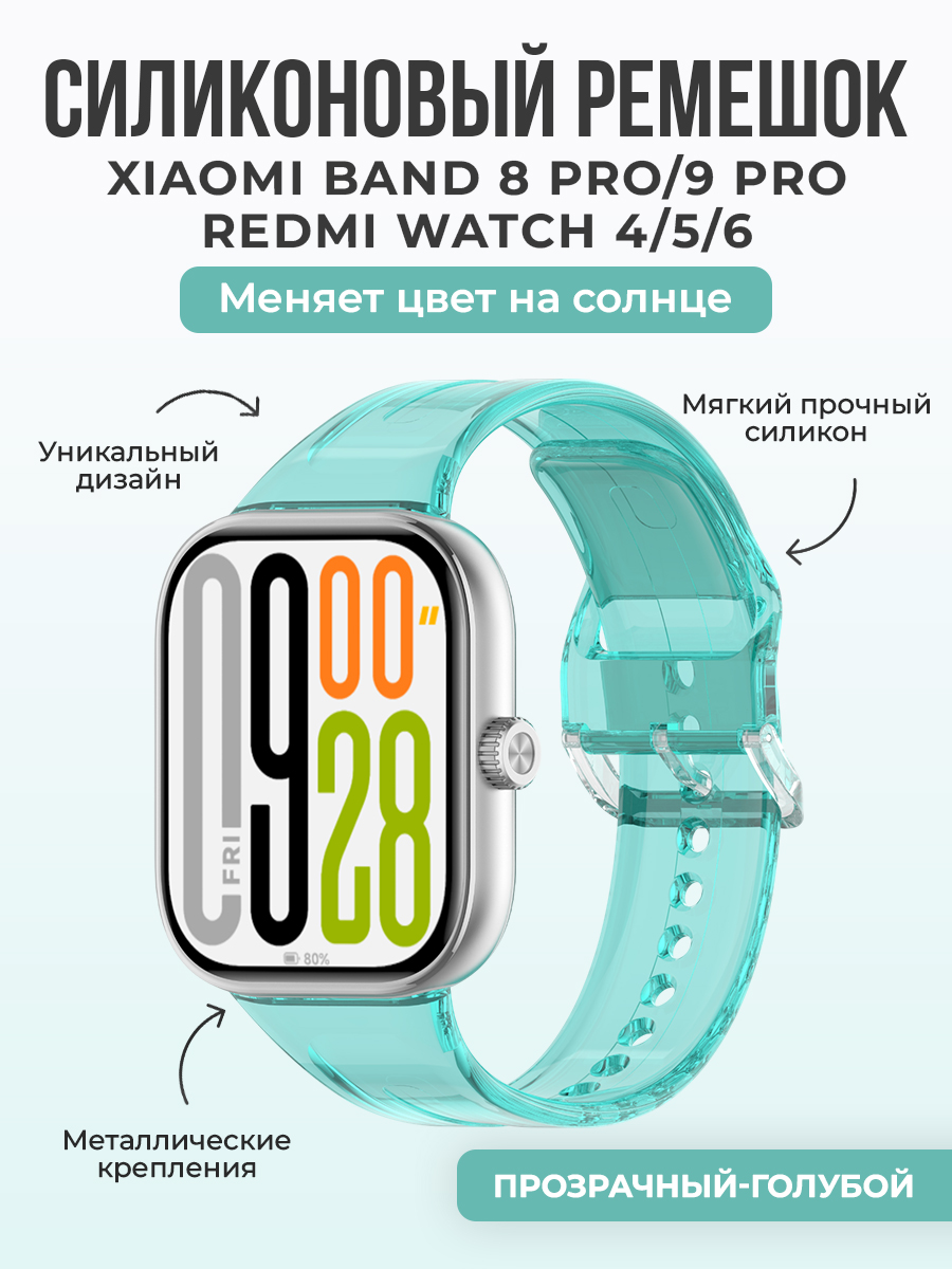 Силиконовый ремешок Xiaomi Band 8 Pro/9 Pro/Redmi Watch 4/5/6, меняет цвет на солнце, прозрачный-голубой