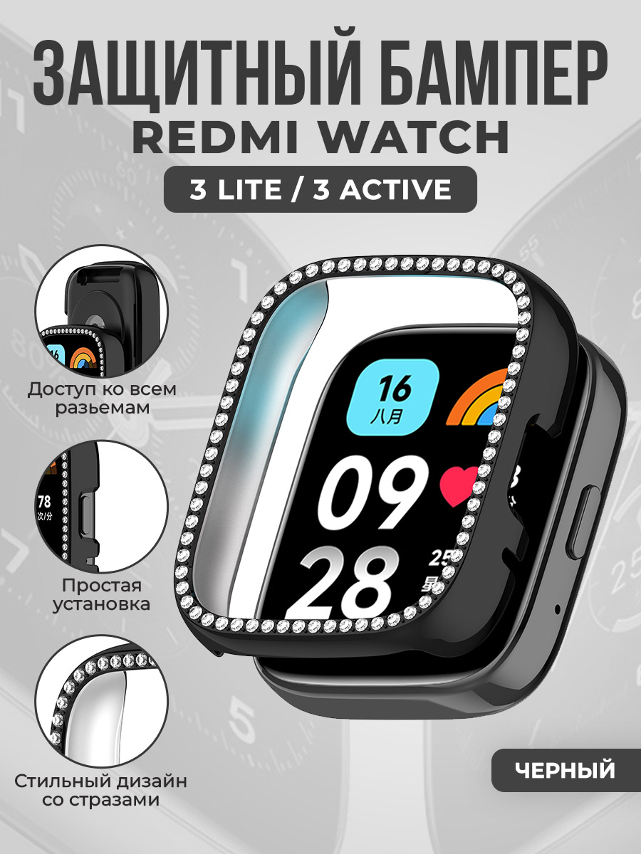 Защитный бампер со стразами для Redmi Watch 3 Lite/Redmi Watch 3 Active, черный