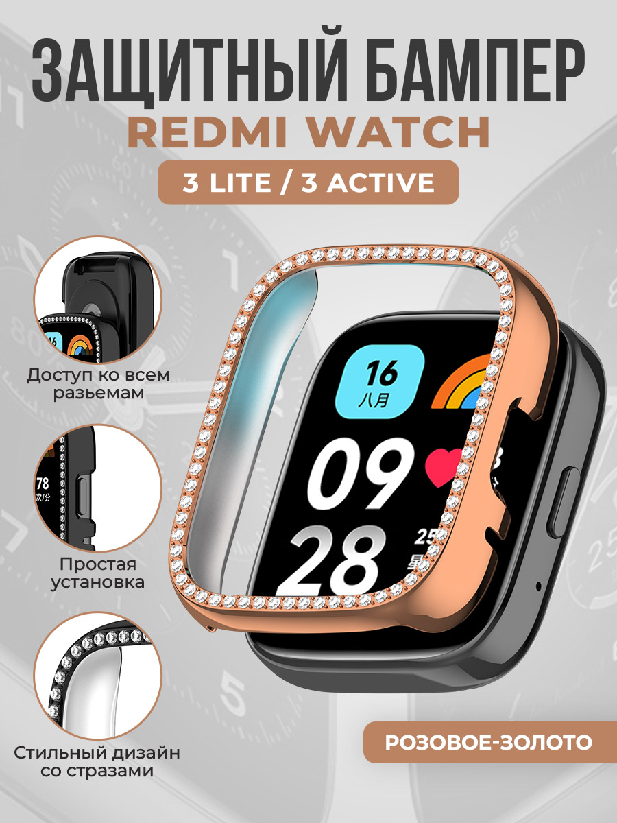 Защитный бампер со стразами для Redmi Watch 3 Lite/Redmi Watch 3 Active, розовое-золото