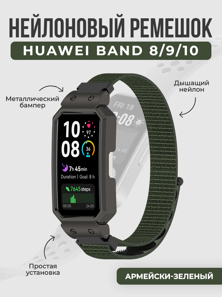 Нейлоновый ремешок с металлическим бампером для Huawei Band 8/9/10, армейски-зеленый
