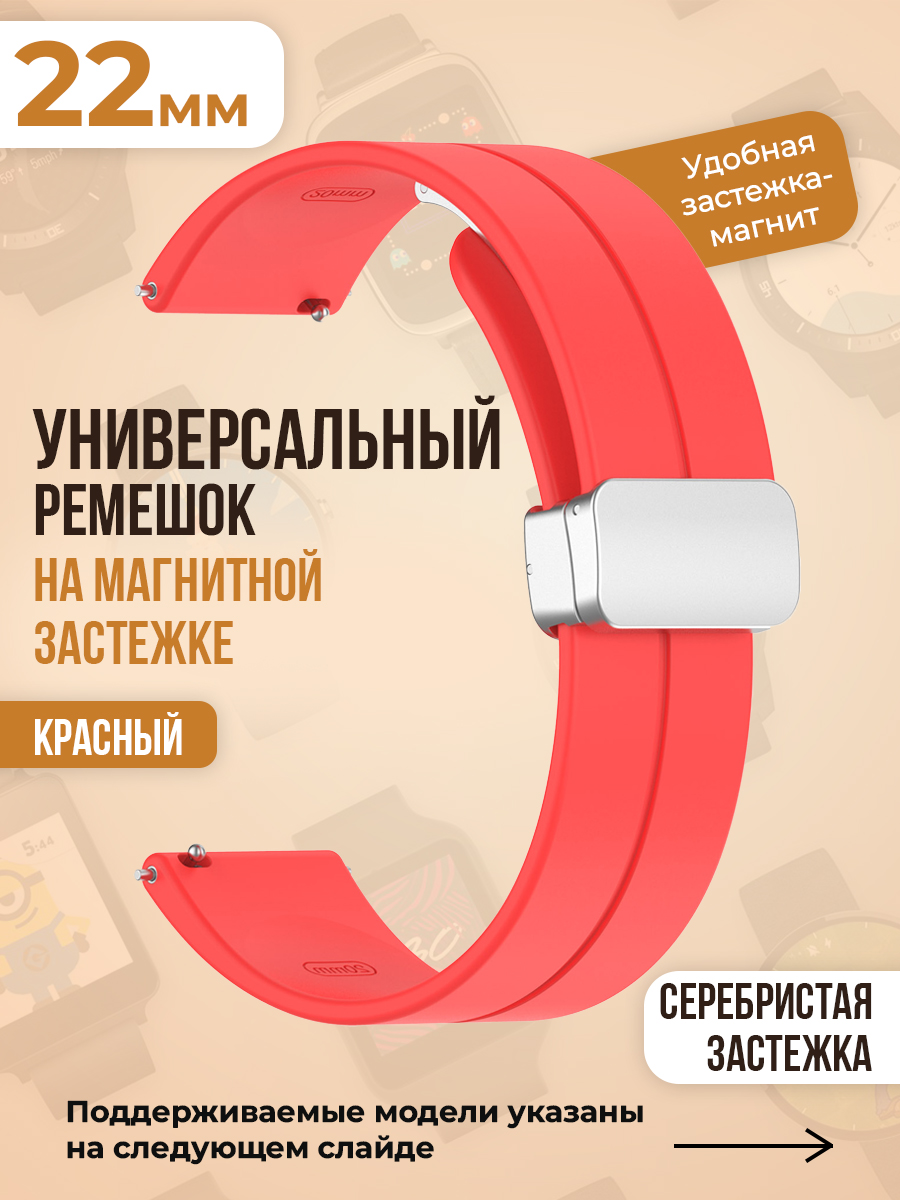 Универсальный силиконовый ремешок с магнитом 22 мм, серебристая застежка, красный