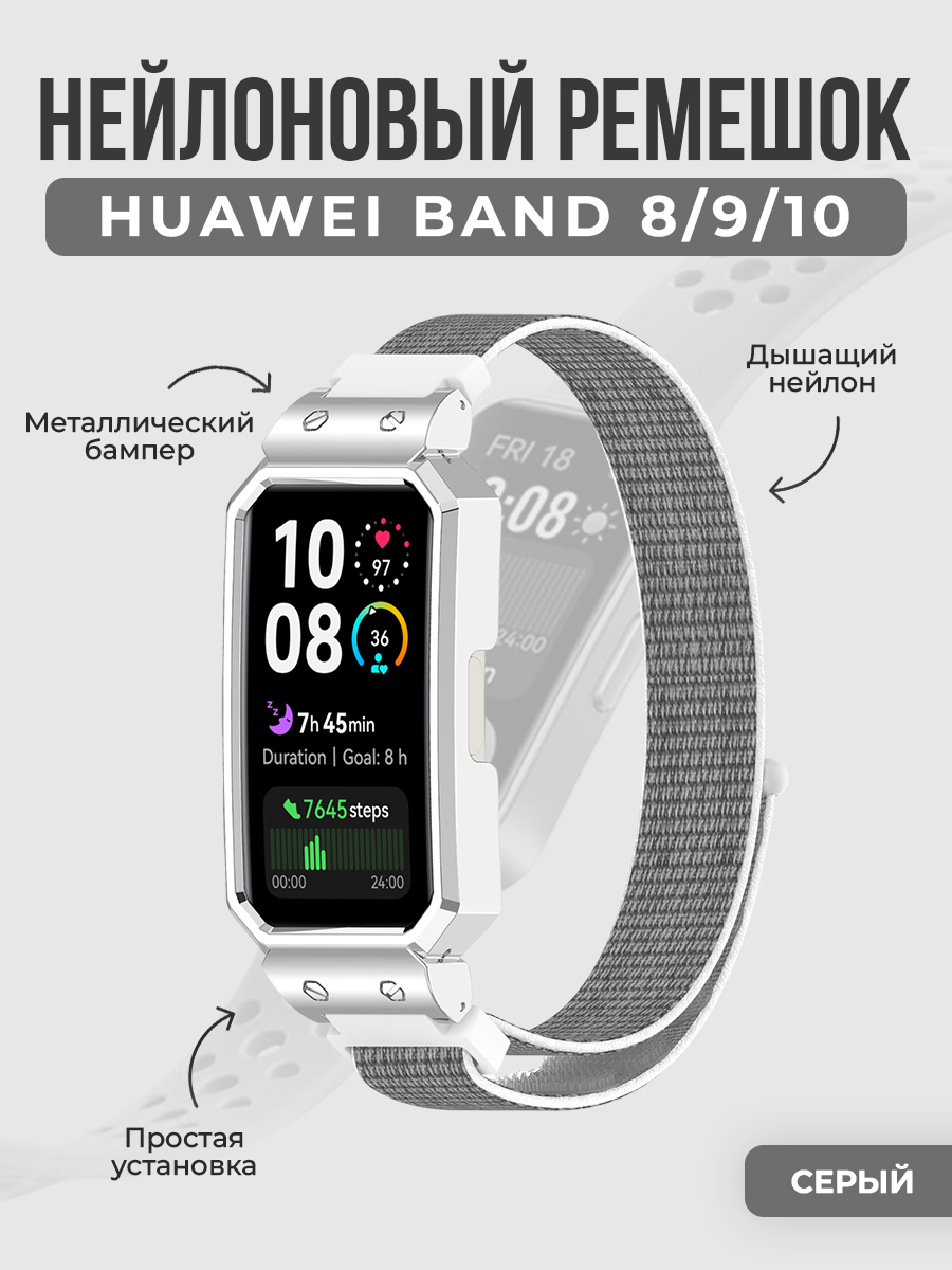 Нейлоновый ремешок с металлическим бампером для Huawei Band 8/9/10, серый
