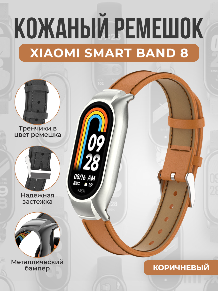 Кожаный ремешок с металлическим бампером для Xiaomi Smart Band 8, коричневый