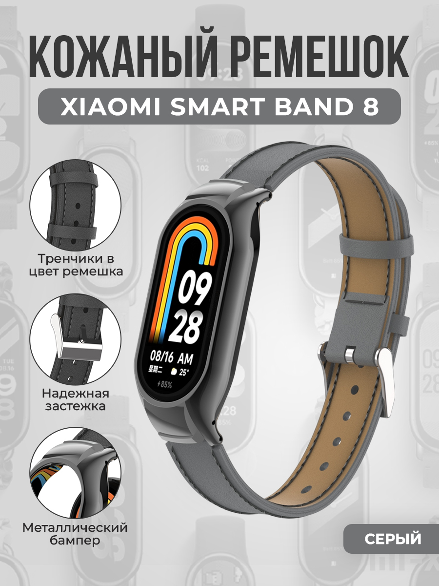 Кожаный ремешок с металлическим бампером для Xiaomi Smart Band 8, серый
