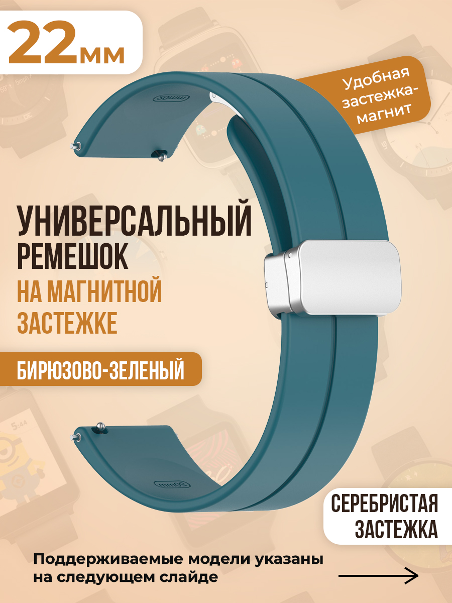 Универсальный силиконовый ремешок с магнитом 22 мм, серебристая застежка, бирюзово-зеленый