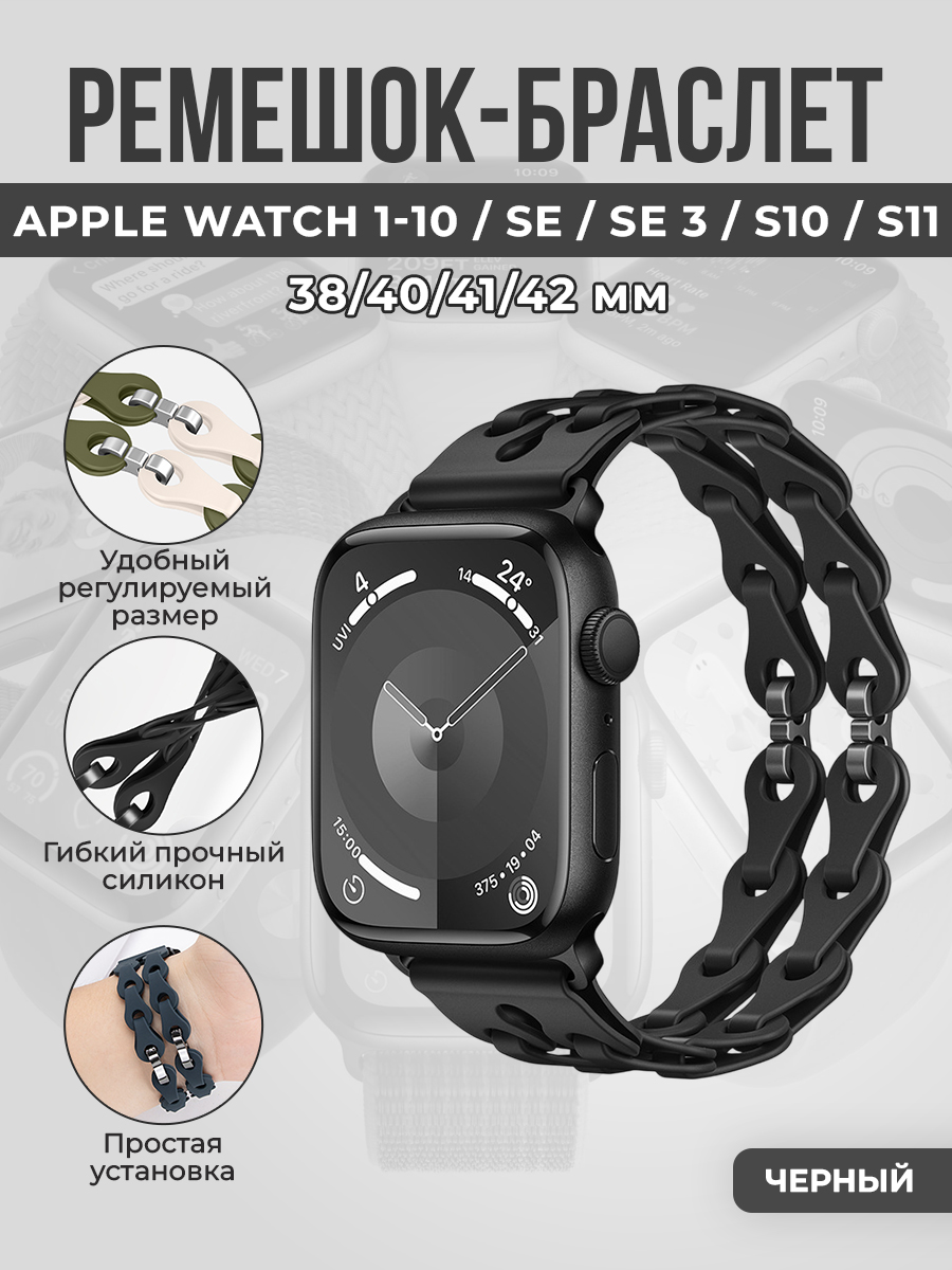 Модный силиконовый ремешок-браслет для Apple Watch 1-9 / SE / SE 3 (38/40/41 мм), 11/S10/S11, 42мм, черный