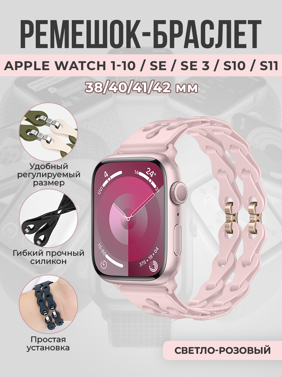 Модный силиконовый ремешок-браслет для Apple Watch 1-9 / SE / SE 3 (38/40/41 мм), 11/S10/S11, 42мм, светло-розовый