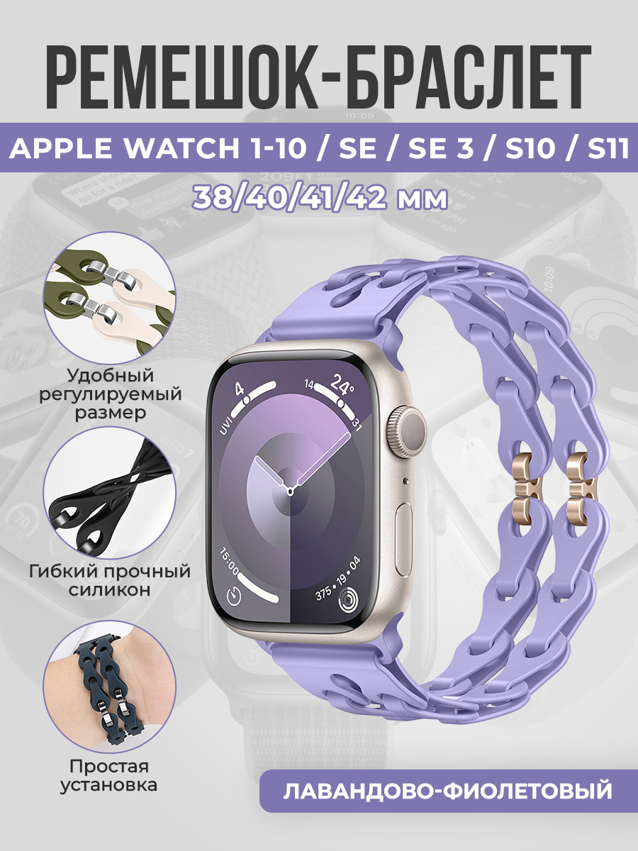 Модный силиконовый ремешок-браслет для Apple Watch 1-9 / SE / SE 3 (38/40/41 мм), 11/S10/S11, 42мм — идеальное сочетание стиля, комфорта и долговечности. Этот ремешок станет отличным дополнением к вашему устройству, превращая повседневное использование в удовольствие и подчеркивая индивидуальность владельца. Он подходит для широкого диапазона моделей, что делает его универсальным решением для тех, кто ценит удобство и современный дизайн. Изготовленный из высококачественного силикона, ремешок приятен на ощупь и мягко прилегает к коже запястья. Гипоаллергенный состав минимизирует риск раздражений, что особенно важно для ежедневного ношения. Силикон обладает отличной эластичностью, благодаря чему ремешок сохраняет форму и не растягивается после длительного использования. Легкость ухода обеспечивает простое удаление загрязнений простой протиркой влажной салфеткой или мыльной воды. Ремешок разработан так, чтобы без проблем подходить к Apple Watch 1-9 / SE (38/40/41мм) и S10 (42мм). Благодаря пошагово продуманной системе крепления, вы легко подберете оптимальную посадку на любую руку и сможете быстро заменить ремешок без помощи инструментов. Это особенно удобно для людей, которые хотят менять стиль в зависимости от настроения, событий или спортивной активности. В описании мы используем обозначения, которые помогут вам быстро ориентироваться при выборе: Эппл вотч 1-9 и Элл воч 38, 40, 41 мм — это ориентиры размера для безупречной совместимости.