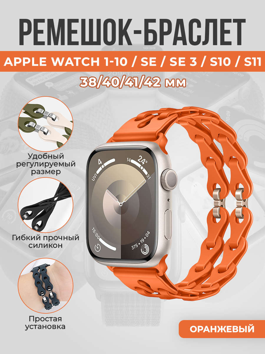 Модный силиконовый ремешок-браслет для Apple Watch 1-9 / SE / SE 3 (38/40/41 мм), 11/S10/S11, 42мм — идеальное сочетание стиля, комфорта и долговечности. Этот ремешок станет отличным дополнением к вашему устройству, превращая повседневное использование в удовольствие и подчеркивая индивидуальность владельца. Он подходит для широкого диапазона моделей, что делает его универсальным решением для тех, кто ценит удобство и современный дизайн. Изготовленный из высококачественного силикона, ремешок приятен на ощупь и мягко прилегает к коже запястья. Гипоаллергенный состав минимизирует риск раздражений, что особенно важно для ежедневного ношения. Силикон обладает отличной эластичностью, благодаря чему ремешок сохраняет форму и не растягивается после длительного использования. Легкость ухода обеспечивает простое удаление загрязнений простой протиркой влажной салфеткой или мыльной воды. Ремешок разработан так, чтобы без проблем подходить к Apple Watch 1-9 / SE (38/40/41мм) и S10 (42мм). Благодаря пошагово продуманной системе крепления, вы легко подберете оптимальную посадку на любую руку и сможете быстро заменить ремешок без помощи инструментов. Это особенно удобно для людей, которые хотят менять стиль в зависимости от настроения, событий или спортивной активности. В описании мы используем обозначения, которые помогут вам быстро ориентироваться при выборе: Эппл вотч 1-9 и Элл воч 38, 40, 41 мм — это ориентиры размера для безупречной совместимости.