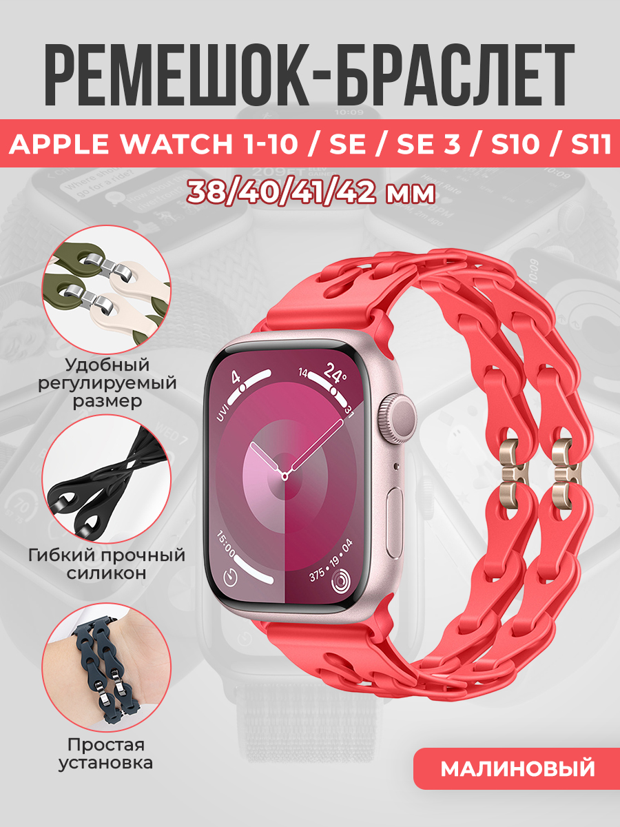 Модный силиконовый ремешок-браслет для Apple Watch 1-9 / SE / SE 3 (38/40/41 мм), 11/S10/S11, 42мм — идеальное сочетание стиля, комфорта и долговечности. Этот ремешок станет отличным дополнением к вашему устройству, превращая повседневное использование в удовольствие и подчеркивая индивидуальность владельца. Он подходит для широкого диапазона моделей, что делает его универсальным решением для тех, кто ценит удобство и современный дизайн. Изготовленный из высококачественного силикона, ремешок приятен на ощупь и мягко прилегает к коже запястья. Гипоаллергенный состав минимизирует риск раздражений, что особенно важно для ежедневного ношения. Силикон обладает отличной эластичностью, благодаря чему ремешок сохраняет форму и не растягивается после длительного использования. Легкость ухода обеспечивает простое удаление загрязнений простой протиркой влажной салфеткой или мыльной воды. Ремешок разработан так, чтобы без проблем подходить к Apple Watch 1-9 / SE (38/40/41мм) и S10 (42мм). Благодаря пошагово продуманной системе крепления, вы легко подберете оптимальную посадку на любую руку и сможете быстро заменить ремешок без помощи инструментов. Это особенно удобно для людей, которые хотят менять стиль в зависимости от настроения, событий или спортивной активности. В описании мы используем обозначения, которые помогут вам быстро ориентироваться при выборе: Эппл вотч 1-9 и Элл воч 38, 40, 41 мм — это ориентиры размера для безупречной совместимости.