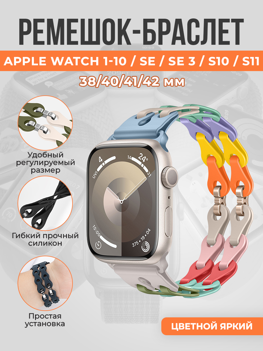 Модный силиконовый ремешок-браслет для Apple Watch 1-9 / SE / SE 3 (38/40/41 мм), 11/S10/S11, 42мм, цветной яркий