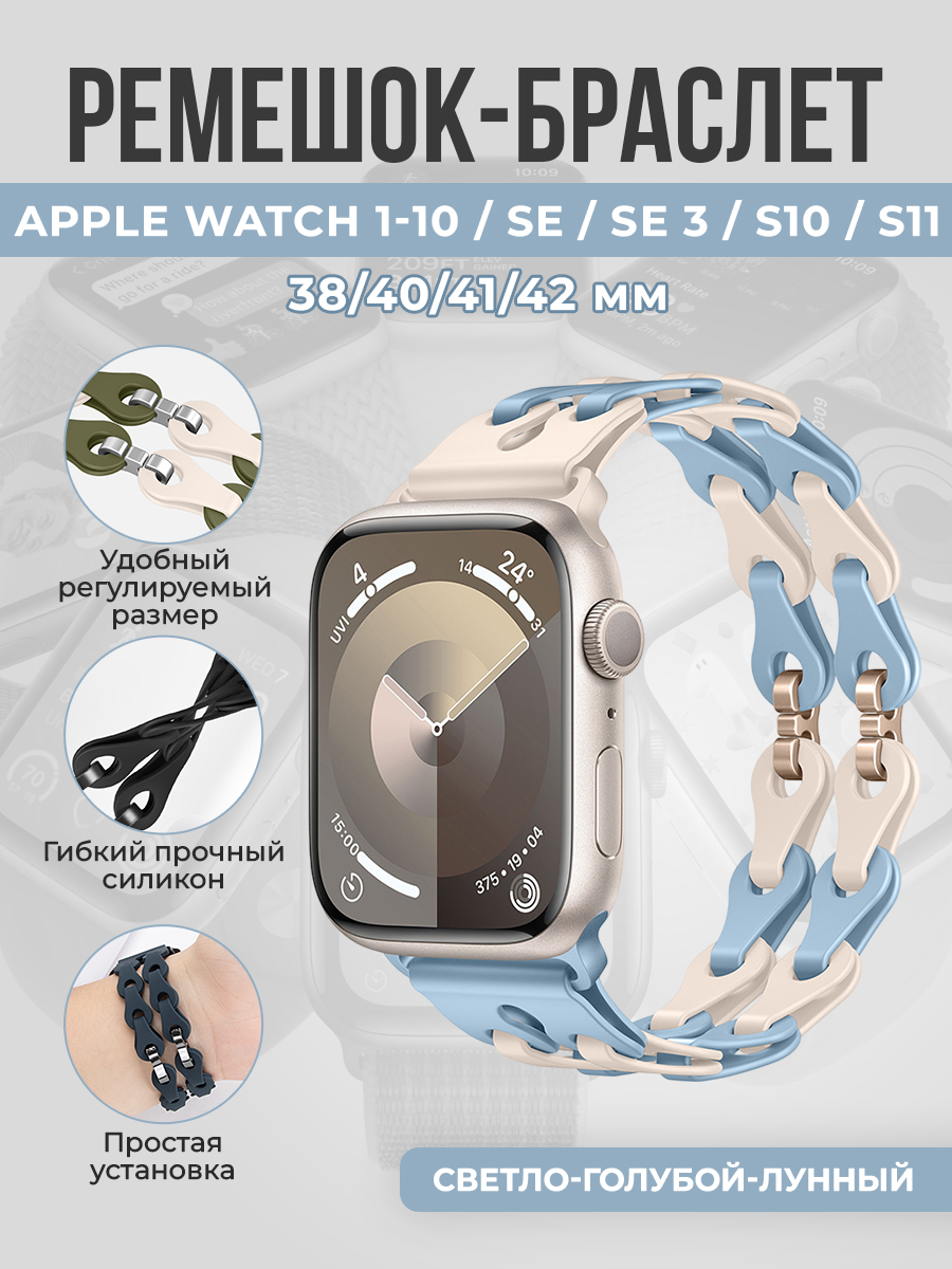 Модный силиконовый ремешок-браслет для Apple Watch 1-9 / SE / SE 3 (38/40/41 мм), 11/S10/S11, 42мм — идеальное сочетание стиля, комфорта и долговечности. Этот ремешок станет отличным дополнением к вашему устройству, превращая повседневное использование в удовольствие и подчеркивая индивидуальность владельца. Он подходит для широкого диапазона моделей, что делает его универсальным решением для тех, кто ценит удобство и современный дизайн. Изготовленный из высококачественного силикона, ремешок приятен на ощупь и мягко прилегает к коже запястья. Гипоаллергенный состав минимизирует риск раздражений, что особенно важно для ежедневного ношения. Силикон обладает отличной эластичностью, благодаря чему ремешок сохраняет форму и не растягивается после длительного использования. Легкость ухода обеспечивает простое удаление загрязнений простой протиркой влажной салфеткой или мыльной воды. Ремешок разработан так, чтобы без проблем подходить к Apple Watch 1-9 / SE (38/40/41мм) и S10 (42мм). Благодаря пошагово продуманной системе крепления, вы легко подберете оптимальную посадку на любую руку и сможете быстро заменить ремешок без помощи инструментов. Это особенно удобно для людей, которые хотят менять стиль в зависимости от настроения, событий или спортивной активности. В описании мы используем обозначения, которые помогут вам быстро ориентироваться при выборе: Эппл вотч 1-9 и Элл воч 38, 40, 41 мм — это ориентиры размера для безупречной совместимости.